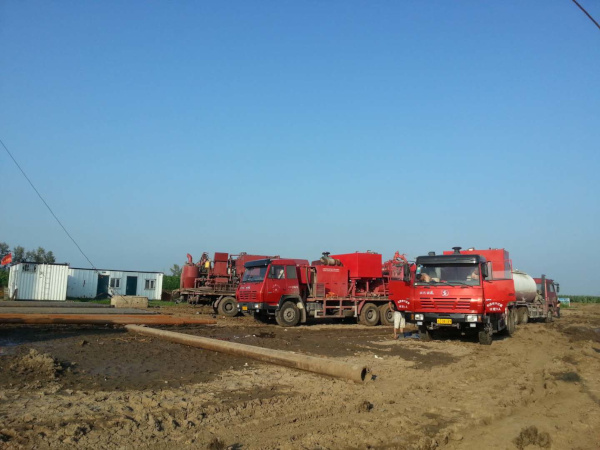 伊22-15-17井,油層套管的固井施工,于2018年7月19日開始,17點(diǎn)30分?jǐn)[好灰罐和泵車等固井車輛,老天眷顧,天氣不錯(cuò),一切準(zhǔn)備就緒。